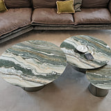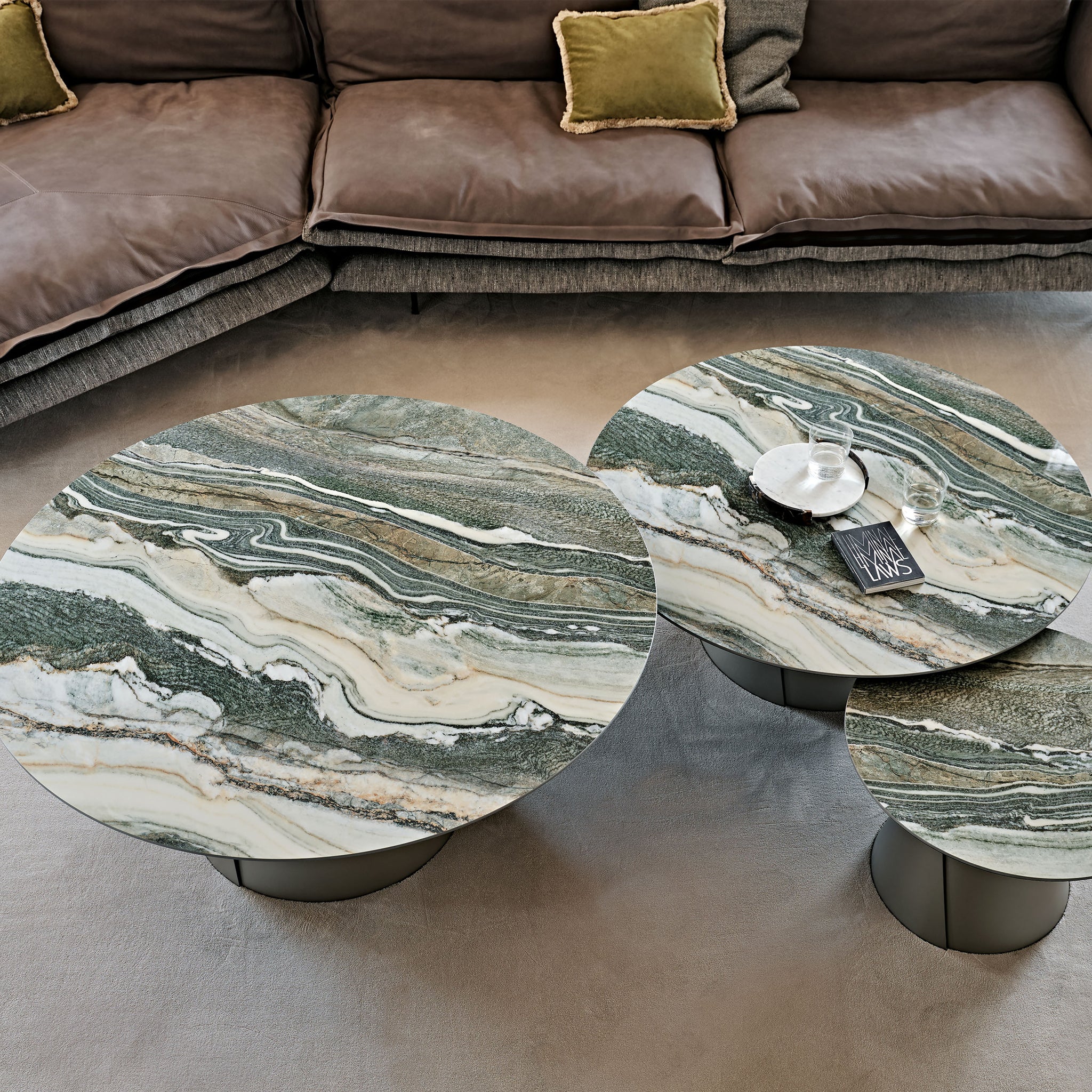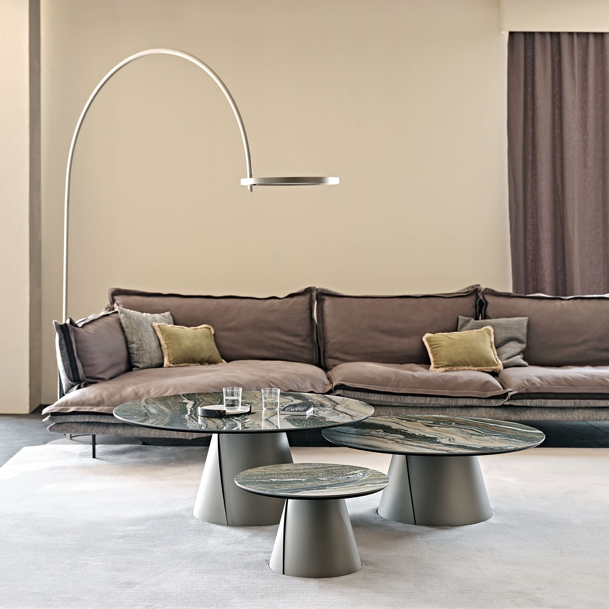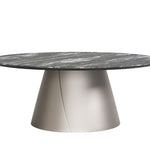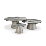 Albert Keramik modern yuvarlak sehpalar, tasarım oturma odasını lineer ama aynı zamanda zarif bir stille zenginleştirir. Üst üste binen iki temel geometriden oluşan bu tasarım sehpalar, farklı yükseklik ve boyutlarda yan yana yerleştirildiğinde kendilerini sonuna kadar ifade ediyor. Birkaç seviyedeki yuvarlak kapakların oyunu, modern seramik sehpaların yıldız haline geldiği, abartısız bir zarafetle döşenmiş bir ortama dinamizm katıyor. Giorgio Cattelan, tek bir katı birim gibi görünen ancak iki haddelenmiş ve üst üste binen çelik levhayı andıran iki çapraz ayrıntı sayesinde ince bir silüete sahip konik bir metal taban tasarladı. Seramik üst kısım, mermer efektli damarları olan çeşitli zarif ve değerli tonlar arasından seçim yapılarak özelleştirilebilir. Sadelik ve detaylara gösterilen özen arasındaki denge, Albert Keramik'i zarif ve temel bir tasarım sehpa yapıyor.