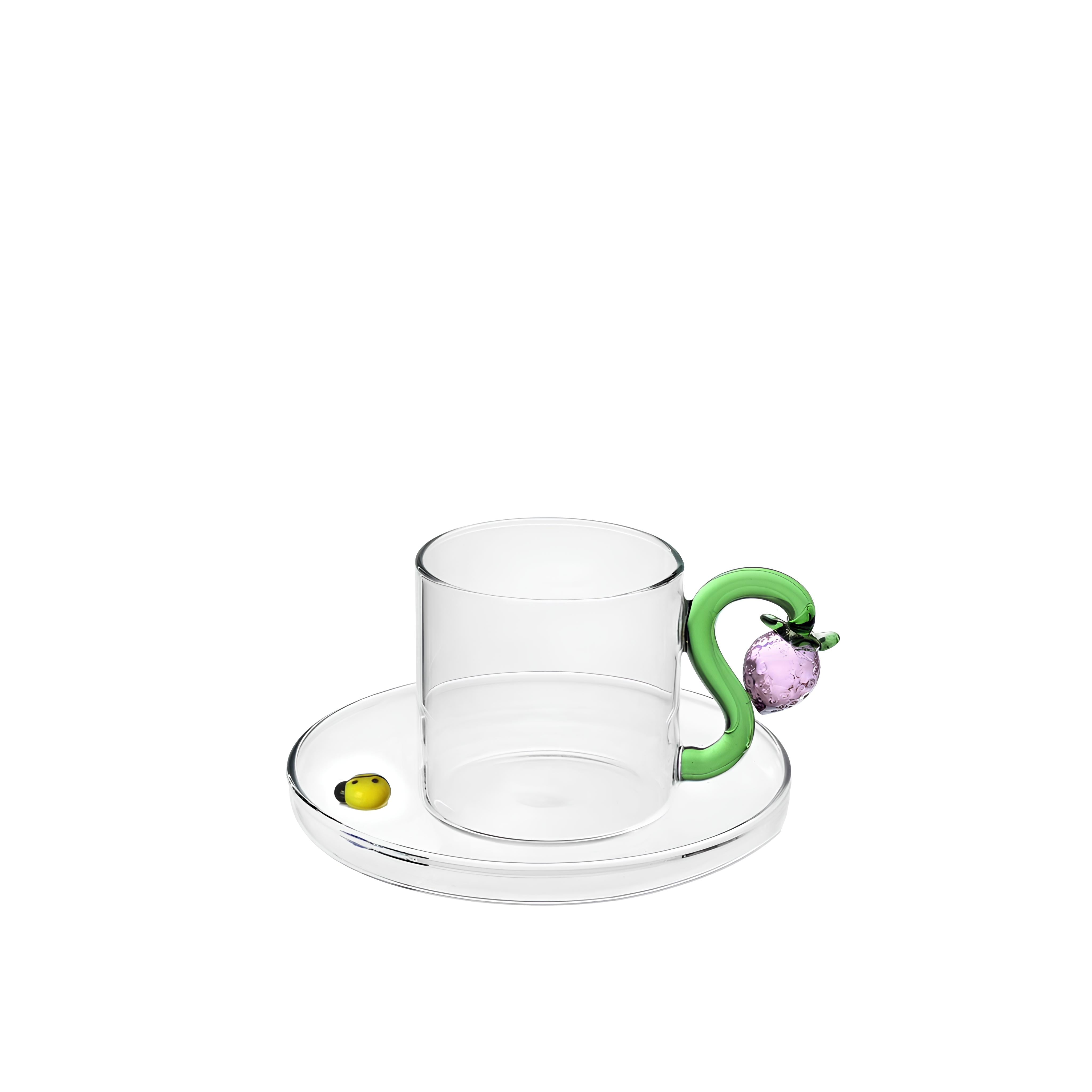 Fruits and Flower koleksiyonundan çilek ve uğur böceği figürlü cam kahve bardağı.